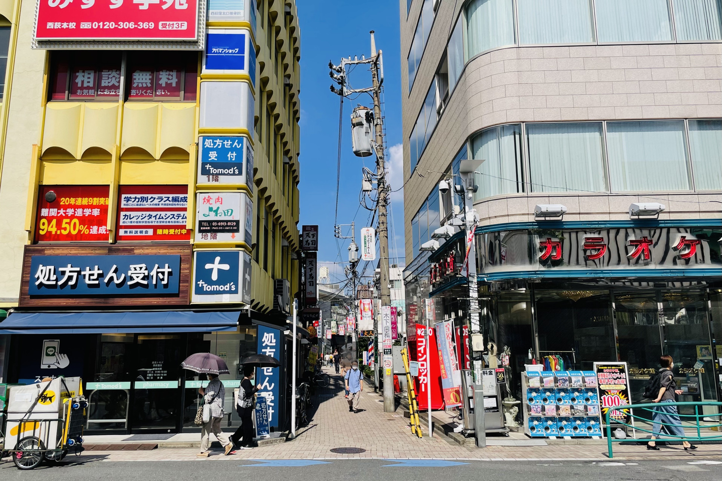 北口を出ると、正面に薬局トモズ(Tomod's)の処方せん受付とカラオケ館があるので、その間の細い路地を入ってください。
