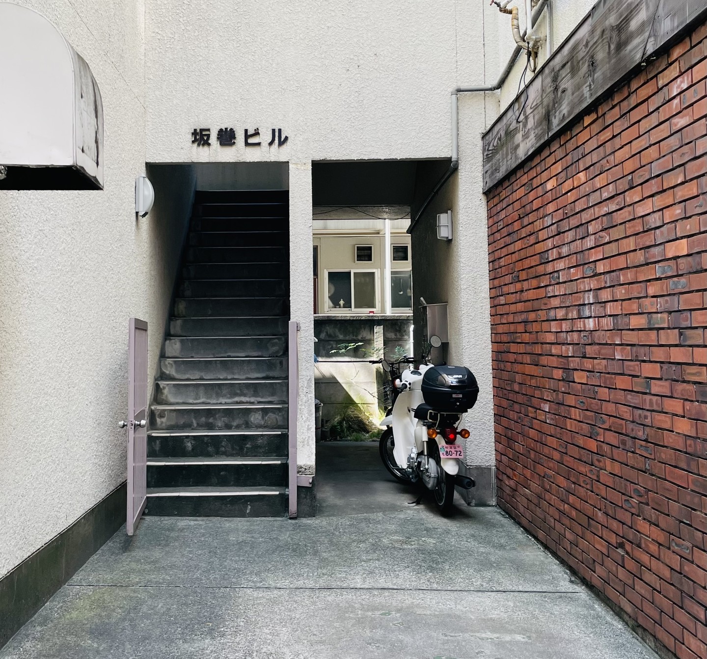 しばらくそのまま進んで、八百屋さん(右手、小高商店さん)を過ぎると、左手に、1階に中華料理屋さん(萬福飯店さん)、スナック(BOY ON A DOLPHINさん)、ラーメン屋さん(コタンさん)が並ぶ建物、坂巻ビルが見えてきます。